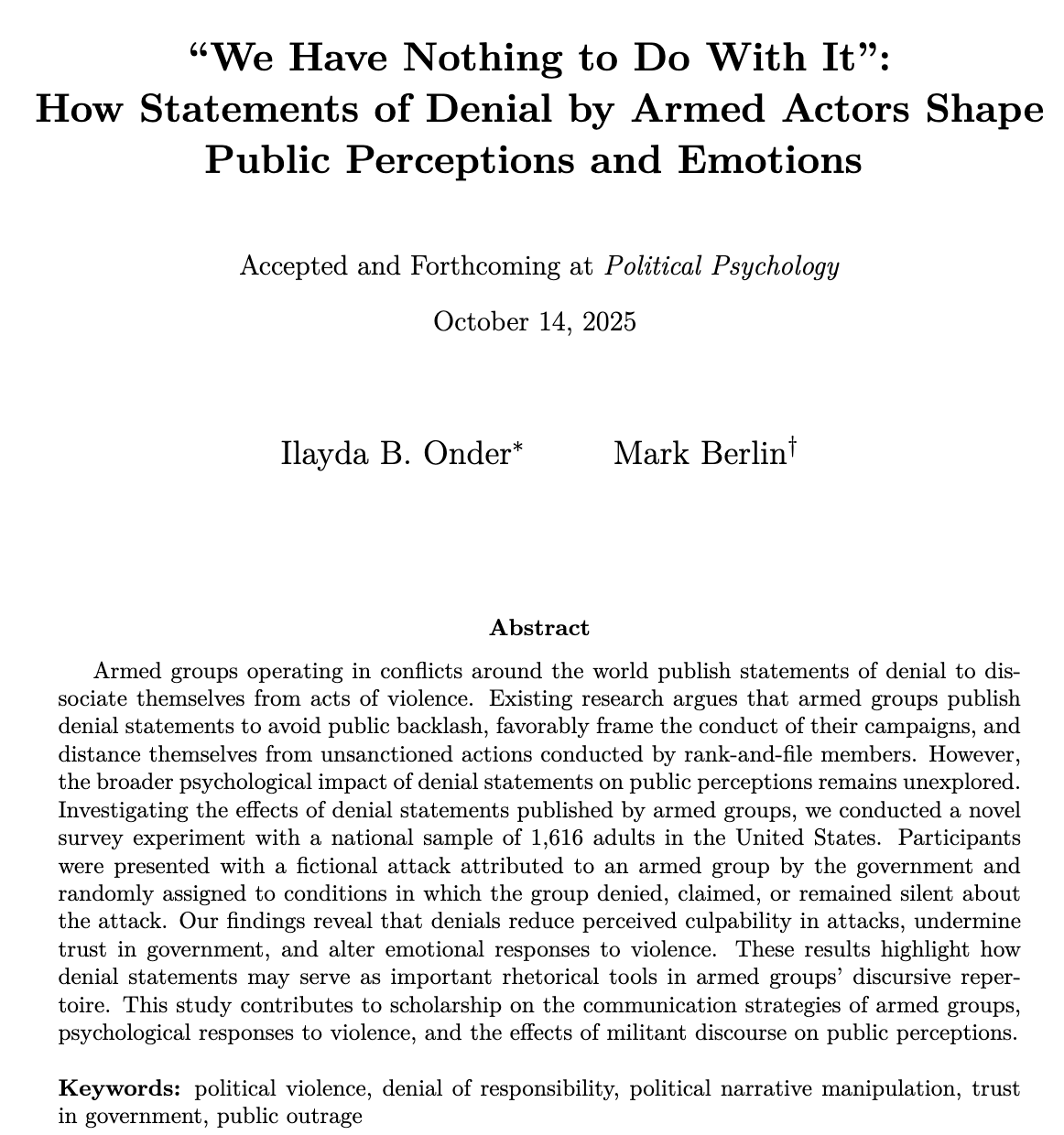 How Statements of Denial by Armed Actors Shape Public Perceptions and Emotions